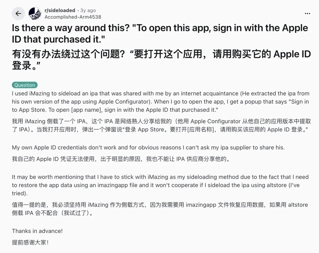 这个弹窗可不是新鲜事儿,早几年就存在了。直接搜英文版提示“sign in with the apple id that purchased it”,YouTube上就有2024年的视频讨论越狱相关问题;Reddit上,三年前的帖子也提到用iMazing工具安装他人账号的App时弹出同样提示。