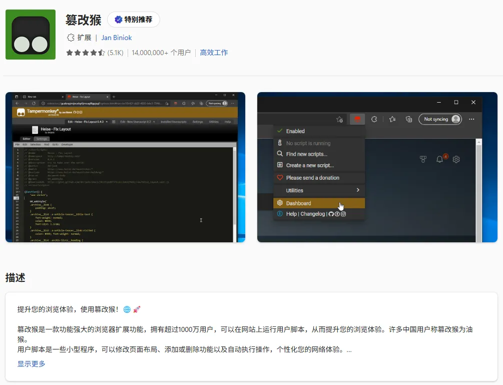 Tampermonkey是一个浏览器用户脚本管理器,有的叫它油猴,有的叫它篡改猴。你可以把它理解为一个“外挂”引擎,里面能够挂载很多代码(脚本),让网页实现更多的不可能,定制你的专属浏览体验。直接在浏览器扩展商店搜索即可下载。