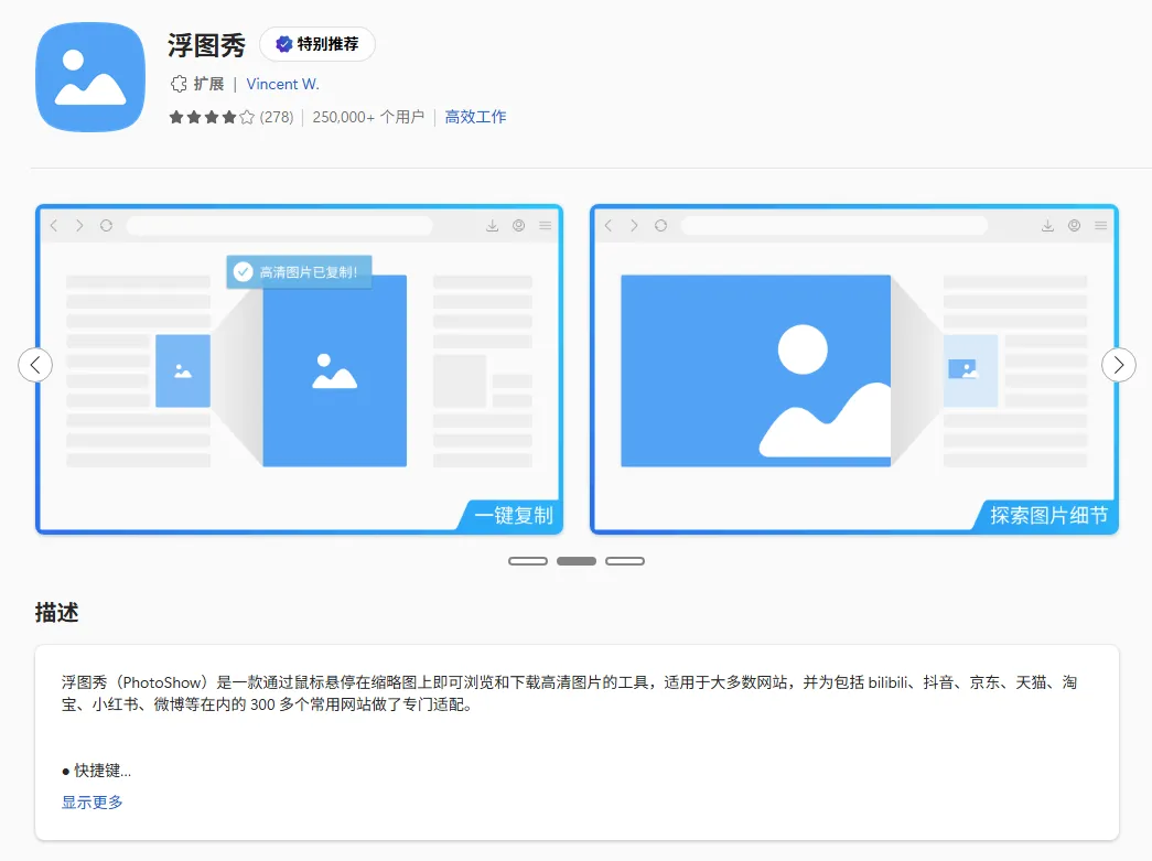 浮图秀(PhotoShow)是一款通过鼠标悬停在缩略图上即可浏览和下载高清图片的工具,适用于大多数网站,并为包括 b站、抖x、x东、x猫、x宝、xx书等在内的 300 多个常用网站做了专门适配。