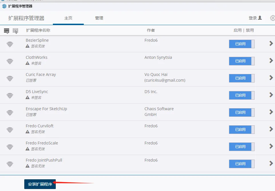 第2步、下载好Curic Studio(瓦工刀套装)后,打开Sketchup软件的窗口-扩展管理器菜单