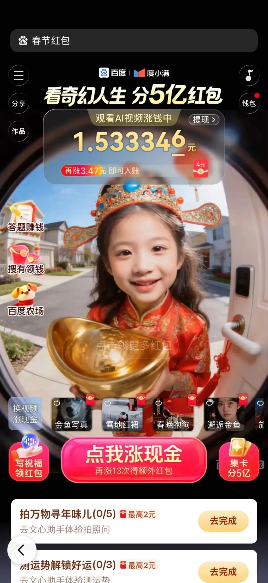 玩法:上百度APP搜索「春节红包」体验与众不同的“人生游戏”。现实中无法实现的「另一种人生」在百度APP都可以愿望成真!