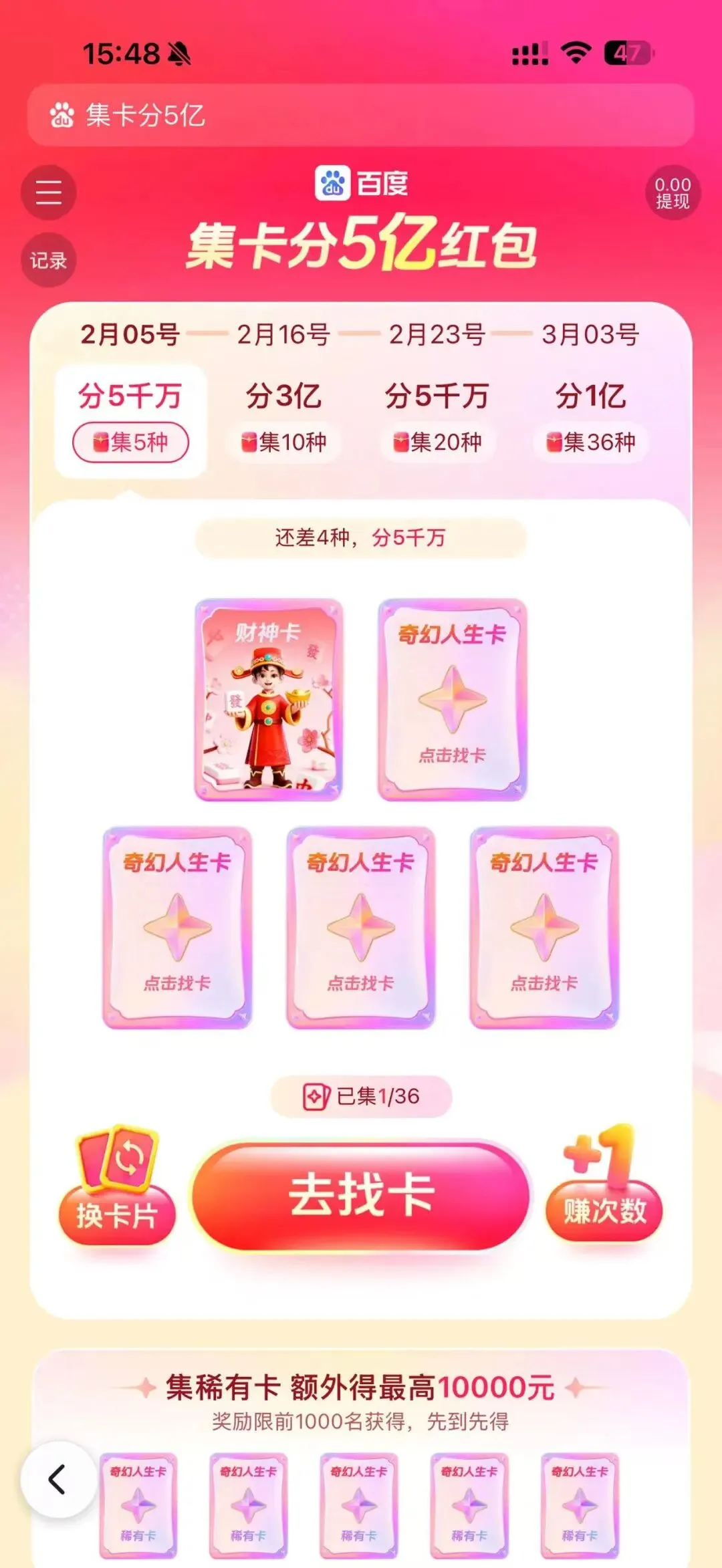 内容:集卡活动共四轮,每一轮集齐后都可以瓜分丰厚奖金!划重点,除了常规卡之外,还有五种稀有卡:马上发财卡、马上转运卡、神马都有卡、一马当先卡、马年大吉卡,集齐这五张卡后无需等待立即开奖,前1000名集齐稀有卡片的用户,最高可获得10000元现金!活动持续至2月24日 万元现金等你拿!