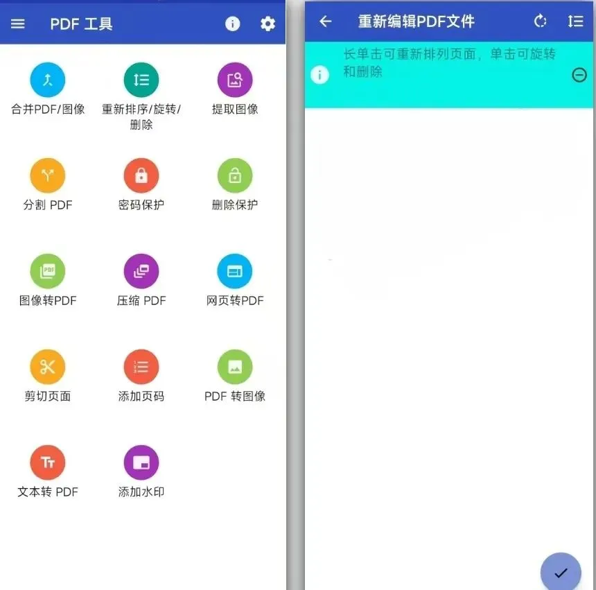 2. 重新排序/旋转/删除页面:收到扫描颠倒的PDF?文件页序乱了?长按页面就能拖动调整顺序,点击就能旋转方向或者直接删除不需要的页面,手机触屏操作特别顺手。