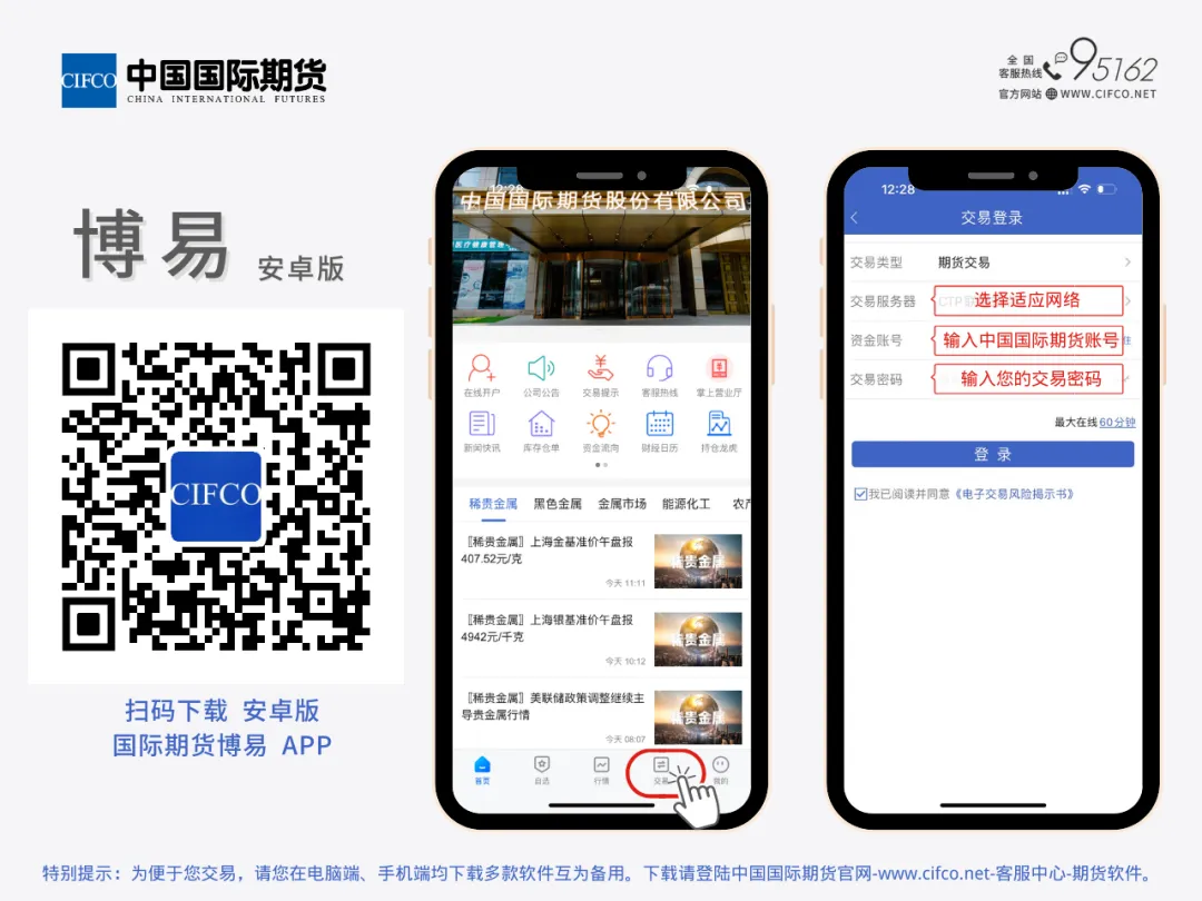您好!请您在下载和使用交易软件之前,务必注意加强自身计算机安全防护,防止用于网上交易的计算机或手机终端感染木马、病毒,以免被恶意程序窃取口令;加强自身账号、口令的保护,不使用简单口令、定期修改口令、输入口令时防止他人偷看、不对他人泄露口令。同时仔细阅读下面的《软件下载免责声明》、《网上交易风险提示书》及《期货多功能网上交易系统使用风险揭示》提示。一经使用中国国际期货的网上交易软件,视为您已经认可下述声明和提示(请进入官网 www.cifco.net 的“客服中心——软件下载”页面或点击“阅读原文”阅览):1.软件下载免责声明;2.网上交易风险揭示;3.期货多功能网上交易系统使用风险揭示。