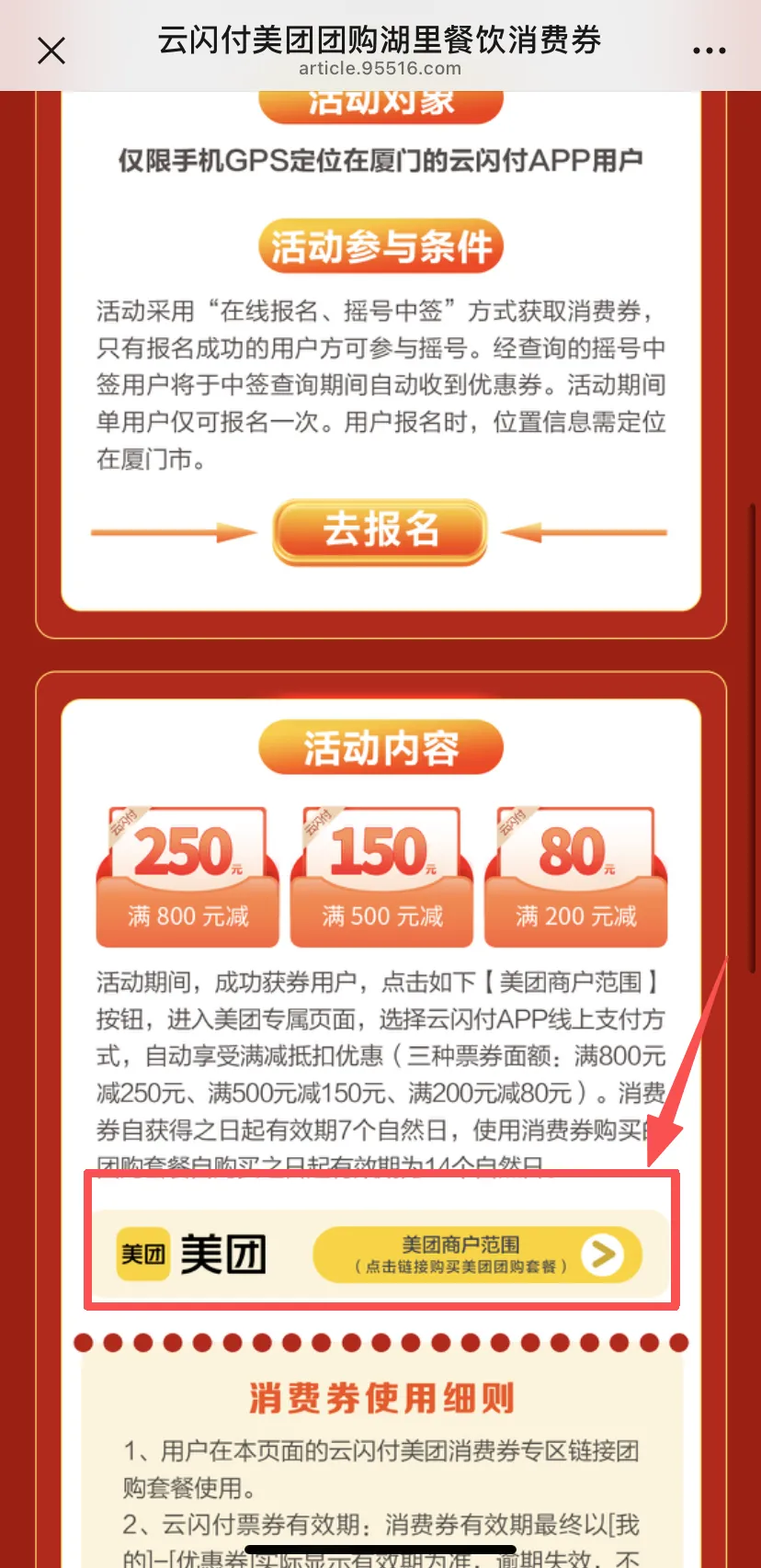 1.消费券使用范围:用户在活动页面的云闪付美团消费券专区链接团购套餐使用。