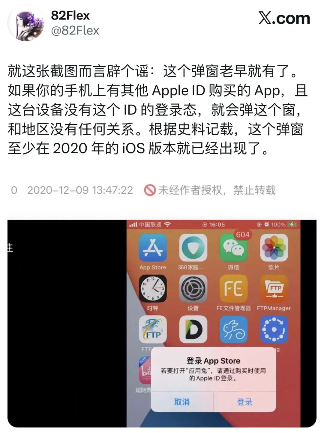如果你的手机上有其他 ApplelD 购买的 App,且这台设备没有这个ID 的登录态,就会弹这个窗。
