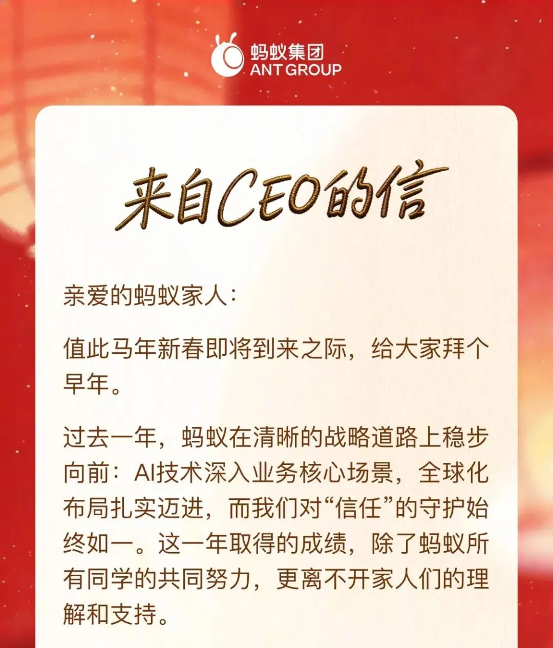据新浪科技报道,蚂蚁集团 CEO 韩歆毅近日向全体员工发布内部信,总结过去一年在 AI 应用、支付创新与全球化布局上的进展,并披露多项关键业务数据。蚂蚁 AI 健康应用「阿福」上个月的月活跃用户数已突破 3000 万,进入中国 AI 应用前四名;AI 创作工具「灵光」已被普通用户用于生成超过 1200 万个小应用,覆盖真实生活场景;支付产品「碰一下」自推出以来,截至去年 12 月 26 日,日支付笔数突破 1 亿,已融入 2260 个生活场景,覆盖手机、眼镜、手表等多终端。内部信以三个真实用户故事展示 AI 技术在生活与健康场景中的落地:包括帮助偏瘫患者沟通的「小话筒」应用、协助用户家属获得更准确诊疗建议的「阿福」、以及在校园中推广「碰一下」的学生用户。韩歆毅表示,这些案例体现了 AI 技术在改善日常生活中的价值。在组织层面,蚂蚁集团过去一年持续推进全球化布局,香港总部亮灯仪式已于近期举行,杭州总部新园区预计将在明年落成。内部文化方面,全球 6 个园区同步举办了「十年羹」活动,超过 7000 名工龄 10 年以上员工参与。韩歆毅在信末表示,蚂蚁将继续投入人工智能等前沿技术,推动智能商业体验升级,并希望在新的一年与员工共同前行。