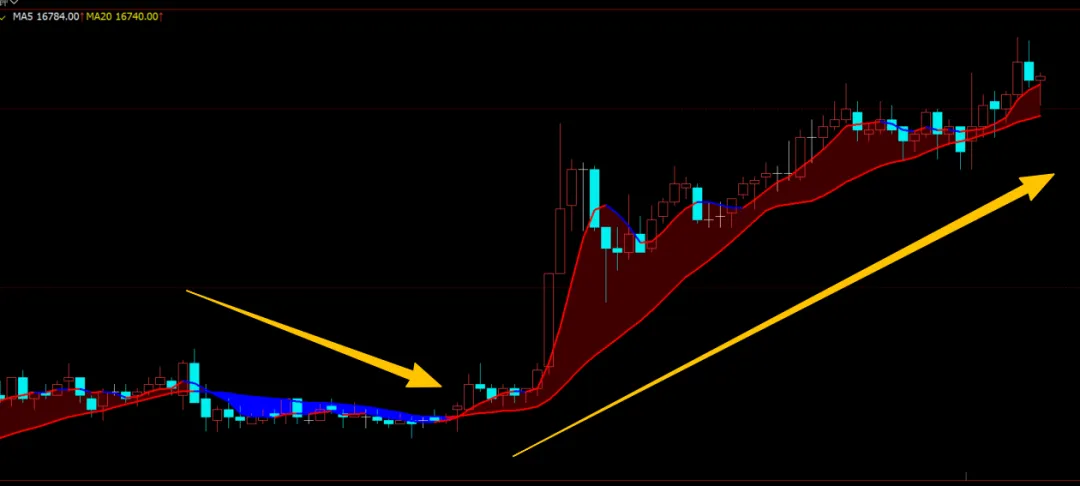 FILLRGN(MA(C,5)>MA(C,20), MA(C,5), MA(C,20), RGB(64,0,0));