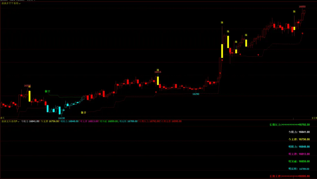 盈满多空平系统主图:支撑压力画线转折,顶底信号,做多做空提示,K变色信号