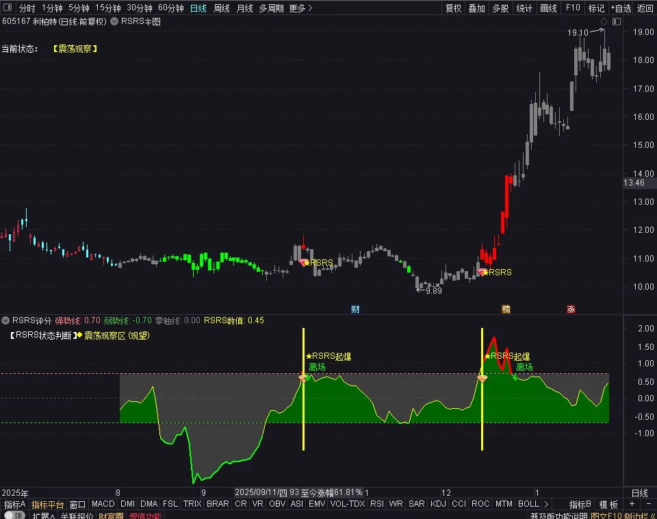 买:RSRS 不是用来抓反弹的,它是用来抓【主升浪】的。当主图K线由灰变红,且下方出现 “RSRS” 信号,或者副图 RSRS数值上穿 0.7 红线。代表趋势反转,多头控盘,出击。只要副图数值在 0.7 之上(红色填充区域),或者主图K线是红色的。都可以无脑关注,不要因为盘中震荡就下车,吃到鱼尾为止。
