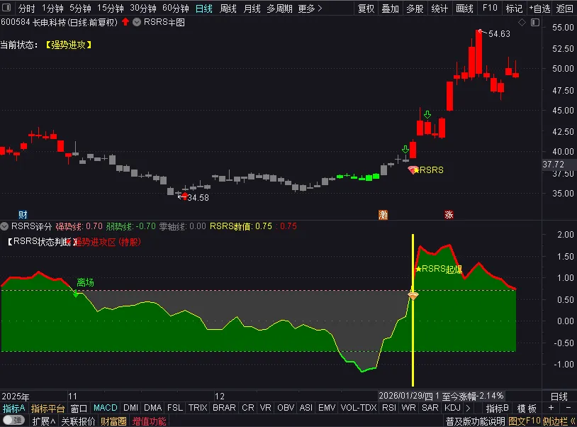 卖:当副图数值跌破 0.7(脱离强势区),或者数值直接跌破 -0.7(进入熊市)。直接止盈离场,切换到防守模式。