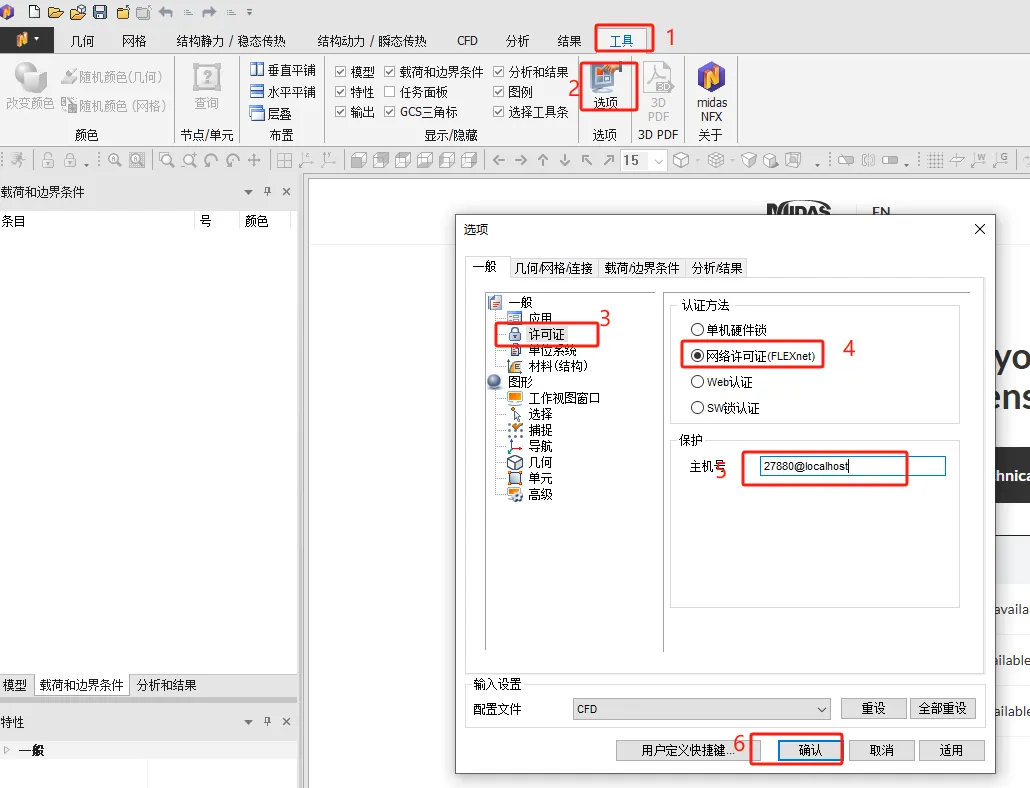 第三十二步:依次点击【工具】–【选项】–【许可证】–【网络许可证】,在主机号入输入【27880@localhost】,然后点【确定】。