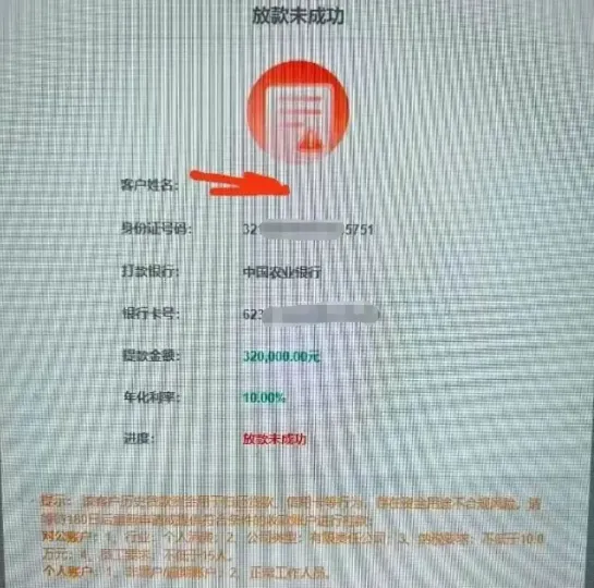 更离谱的是一张假冒农业银行的“放款未成功”页面,不仅设计山寨,提示内容更是令人啼笑皆非。