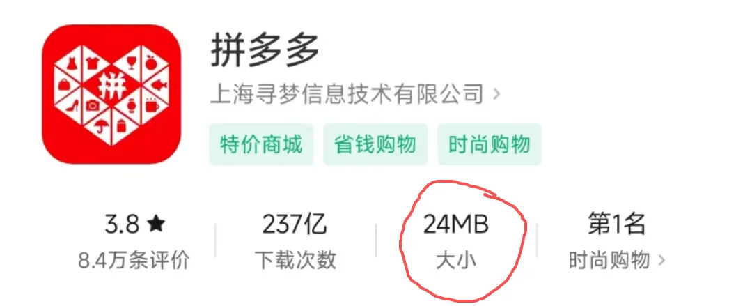 再看看软件体积,明明也有种水果、多多视频、多多买菜、现金红包这么多功能应用,是怎么做到这么小的体积的。