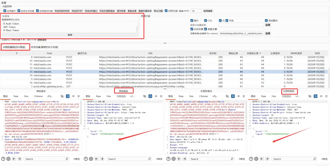 主动扫描和被动扫描模式:支持在Burp主动扫描中使用,也可以被动监控所有流量自定义认证头:可配置需要移除的认证头列表可调整的检测阈值:可设置响应长度差异阈值,灵活适应不同应用场景详细的调试信息:提供完整的请求处理日志,便于排查问题强大的错误处理:包含请求重试机制,确保检测过程稳定可靠丰富的结果展示:直观查看检测结果及详细信息导出功能:支持将检测结果导出为Markdown或文本文件,以及导出API接口为JSON格式流量记录:记录所有经过的流量,便于后续分析