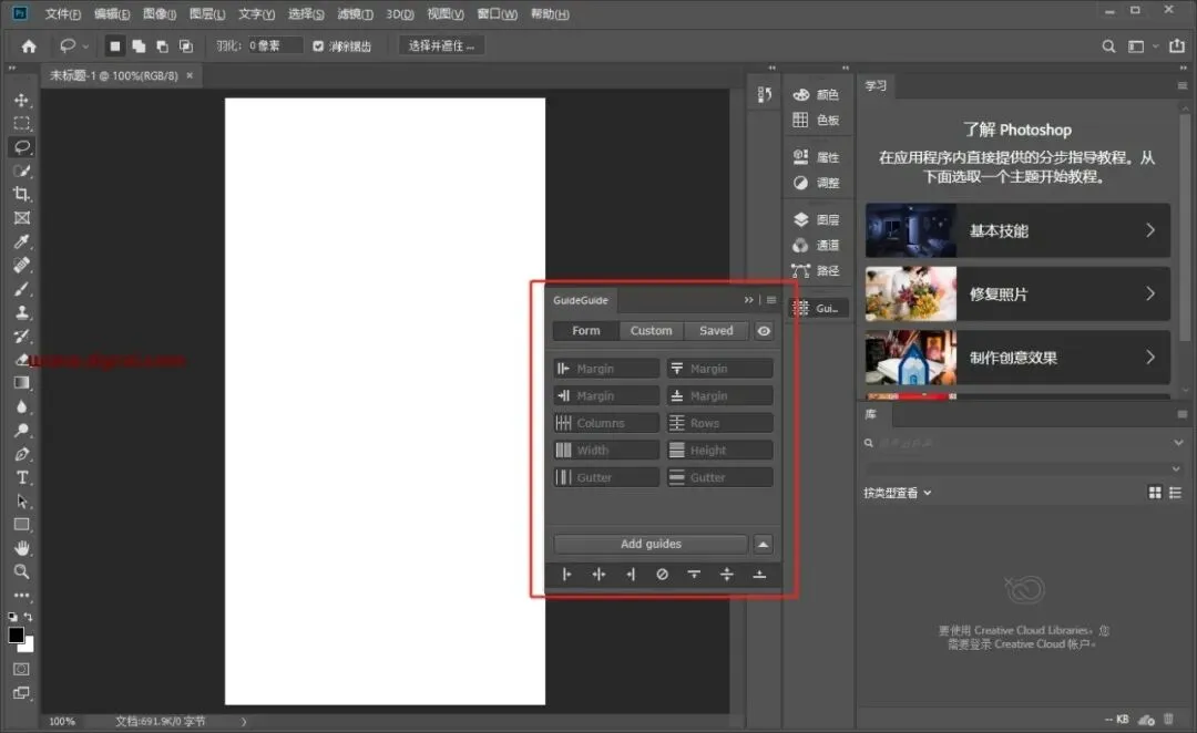 打开PS软件,新建文档,点击窗口-扩展功能-GuideGuide