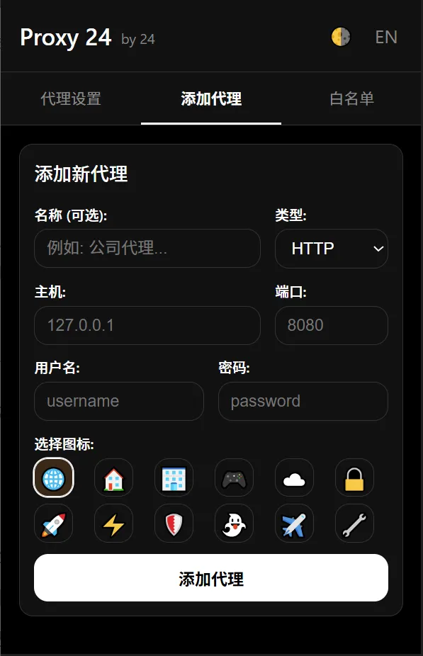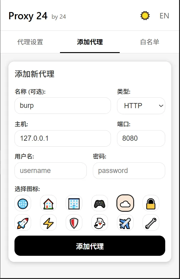 @24师傅分享的一个简单便捷、适合小白的浏览器Proxy代理插件,白名单很干净,没有任何后门,干净又卫生!如果该项目对你有用还请给点个Star!