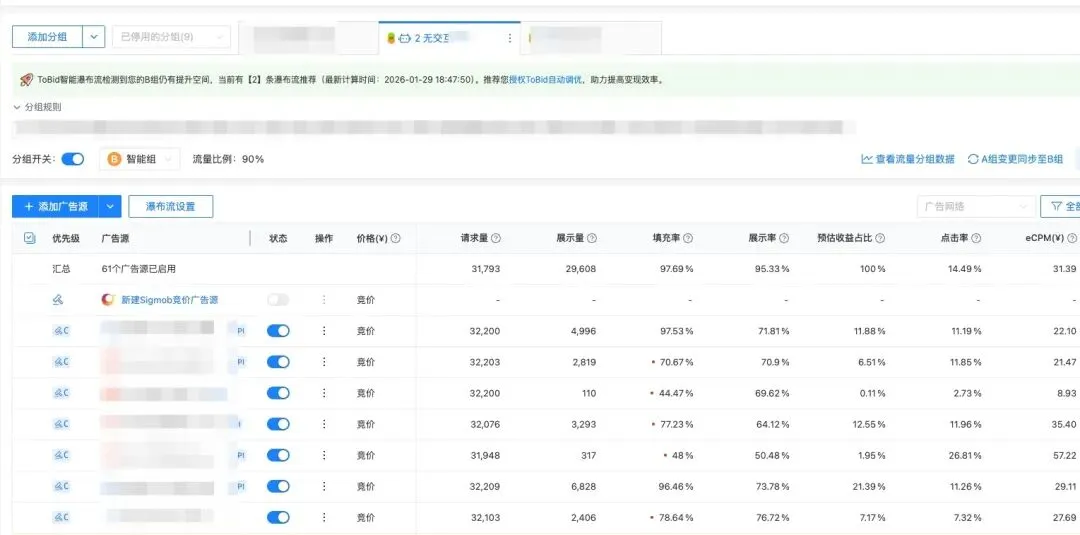 第三,让收益“自己卷起来”(聚合竞价)这是ToBid的技术底盘。它接入了市面上几乎所有主流的广告平台。当一个广告位要展示时,它不是指定给某一家,而是让所有这些平台实时在线拍卖(RTB)。