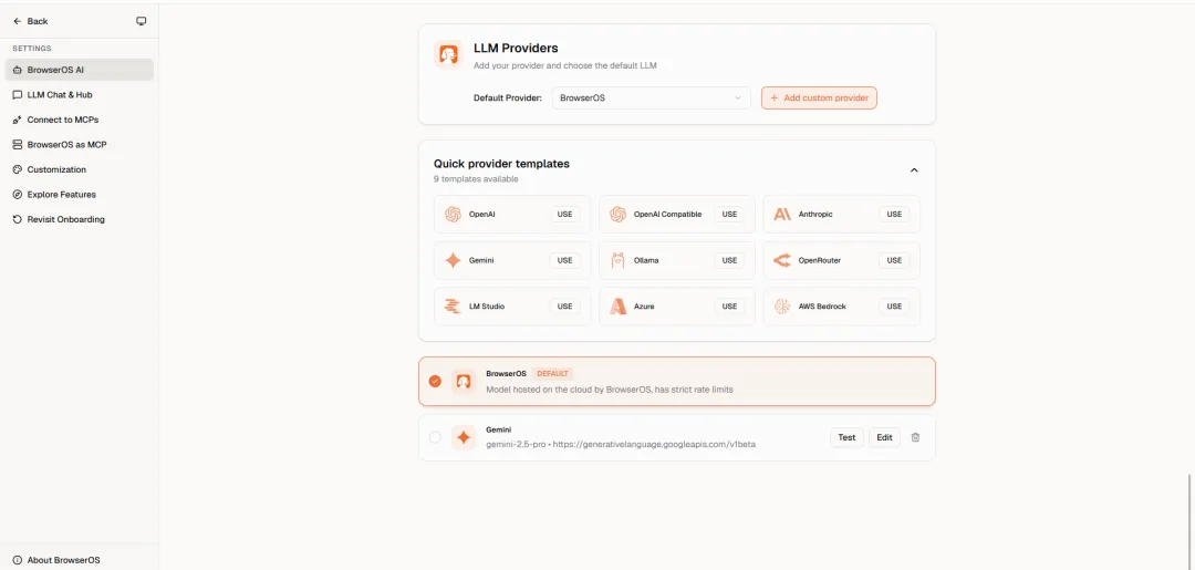 很多人用 AI 都有“选择困难症”:Claude 写代码好,GPT-4 逻辑强,本地跑个模型还省钱。 BrowserOS 倒好,侧边栏直接让你选。你可以左手 Claude,右手 GPT,甚至能连上你电脑本地跑的 Ollama。不花一分钱,也能让 AI 帮你处理隐私文件。