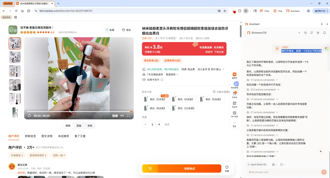 试试这个指令: “请打开淘宝,选择一个5元以下的牙刷。”