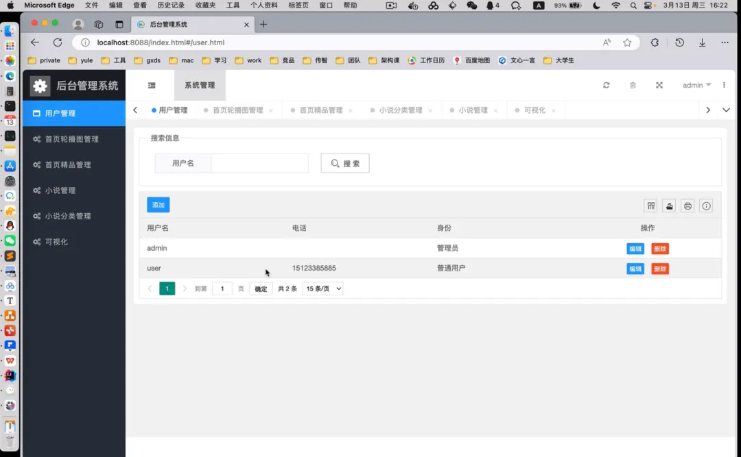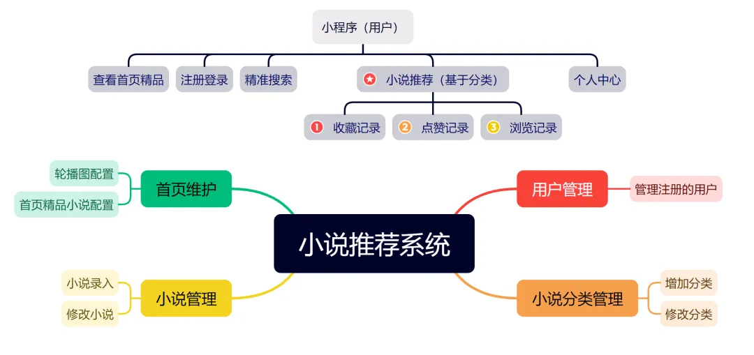系统核心功能分为用户阅读与管理后台两大部分。用户端提供完整的阅读体验功能,包括首页精品推荐、分类精准搜索、基于用户偏好与分类的小说智能推荐,以及个人中心的收藏、点赞与浏览记录管理。管理后台提供全面的内容与用户运维能力,包括首页轮播图与精品区块的灵活配置、注册用户的信息查询与管理、小说资源的录入与分类管理(支持分类的增加与修改),以及对已上架小说信息的编辑与维护。通过将系统化的内容管理后台与轻便易用的小程序前端相结合,平台在保障内容更新效率与运营管控能力的同时,为用户提供了流畅、个性化的移动阅读体验。