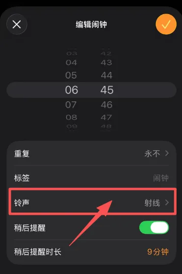 首先打开闹钟,然后选择【铃声】选项,选择自己喜欢的声音或者音乐。