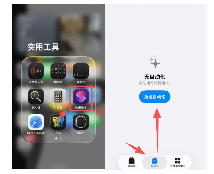 然后我们找到【快捷指令】,底部切换到“自动化”模块,然后点击上方的“新建指令”按钮,新建指令。