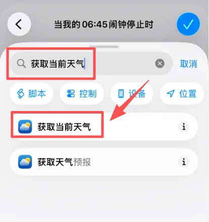 接下来可以在搜索栏中搜索“获取当前天气”,选中下方弹出的模块,然后点击右上角的“确定”按钮。