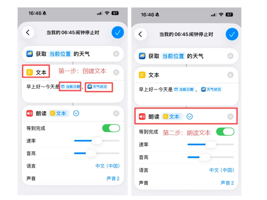 最后我们来到下图这个页面,像我的就显示:会在闹钟停止时获取天气然后朗读我的自定义文本。