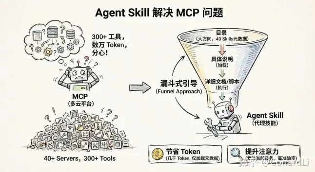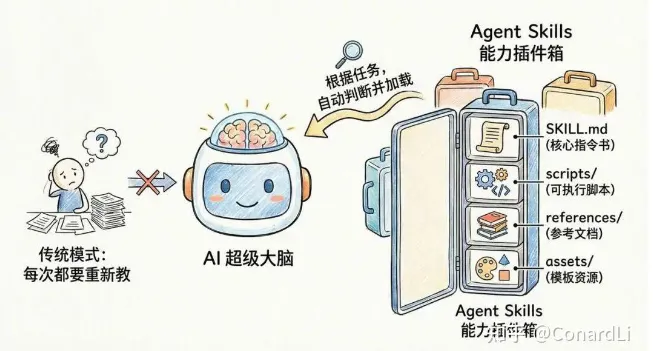 真实的业务场景中,一个 Agent 不可能只干一件这么简单的事。大家试想一下,如果你要给 AI 装 50 个技能,每个技能都有几千字的说明书,要是系统一启动就把这些全塞进 AI 的脑子(Context Window)里,那么就会: