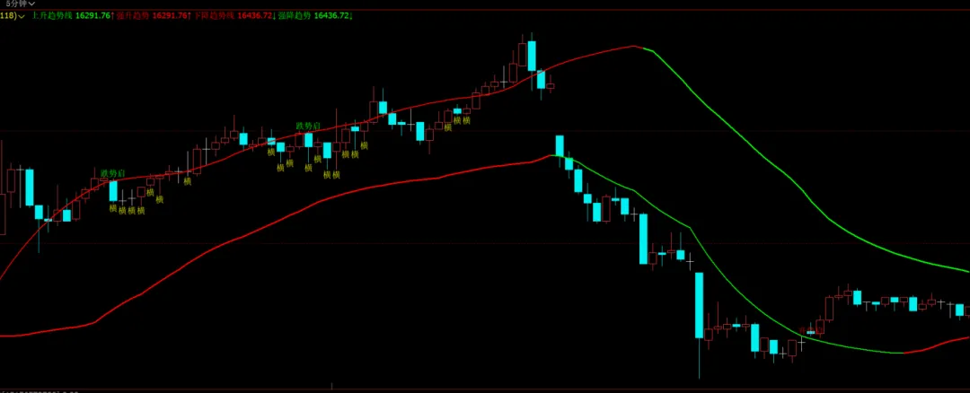 N:=12;上升低点:=LLV(L,N);上升趋势线:DMA(上升低点,0.1),COLORGREEN,LINETHICK2;强升趋势:IF(上升趋势线>REF(上升趋势线,1),上升趋势线,NULL),COLORRED,LINETHICK3;下降高点:=HHV(H,N);下降趋势线:DMA(下降高点,0.1),COLORRED,LINETHICK2;强降趋势:IF(下降趋势线<REF(下降趋势线,1),下降趋势线,NULL),COLORGREEN,LINETHICK3;横盘中轨:=MA(C,N),COLORWHITE,LINETHICK2;DRAWTEXT(CROSS(C,上升趋势线) AND C>横盘中轨&&上升趋势线<REF(上升趋势线,1)&&下降趋势线<REF(下降趋势线,1),L,'升势启'),COLORRED;DRAWTEXT(CROSSDOWN(C,下降趋势线) AND C<横盘中轨&&上升趋势线>REF(上升趋势线,1)&&下降趋势线>REF(下降趋势线,1),H,'跌势启'),COLORGREEN;CZ:=ABS(上升趋势线-下降趋势线);DRAWTEXT((上升趋势线>REF(上升趋势线,1) AND 下降趋势线>REF(下降趋势线,1)||上升趋势线>REF(上升趋势线,1)&&下降趋势线>REF(下降趋势线,1))&&CZ<REF(CZ,1)&&BETWEEN(C,上升趋势线,下降趋势线) ,L,'横'),COLORYELLOW,VALIGN0;