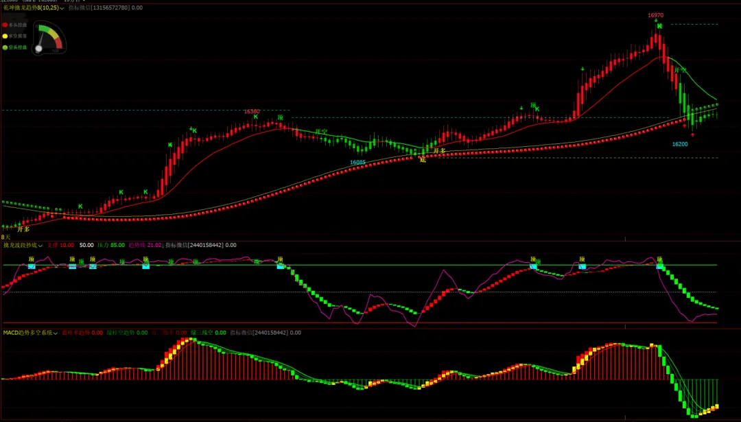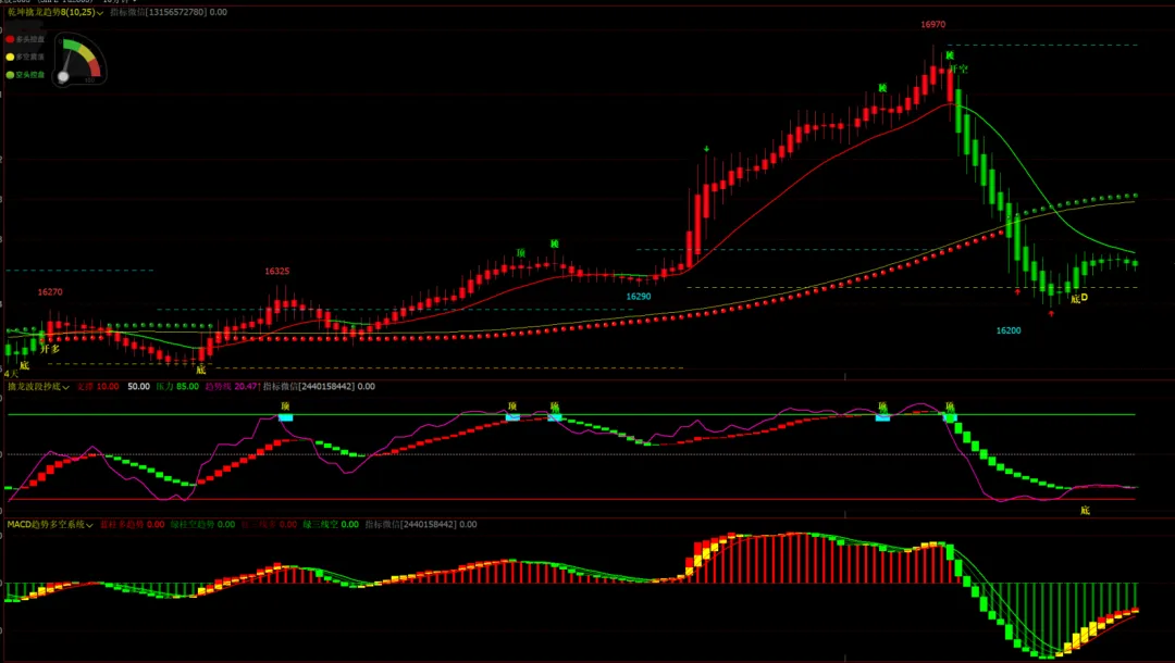幅图:红绿涨跌柱,趋势线,顶底信号,多空反转捕捉
