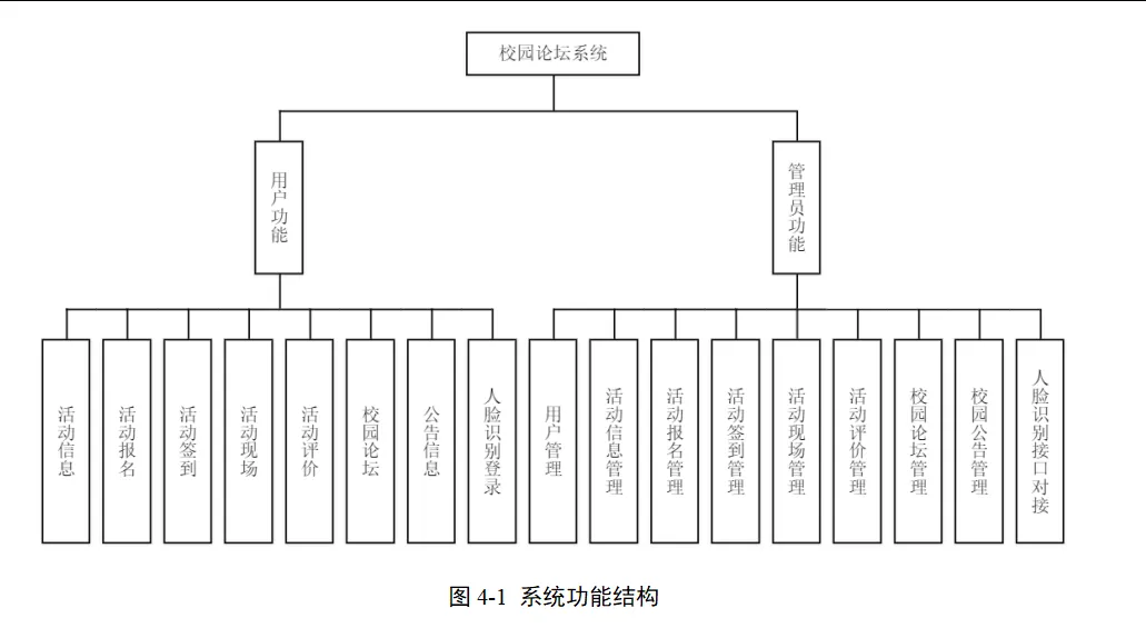 系统采用分层架构设计,分为表现层、业务逻辑层和数据访问层。表现层负责与用户进行交互,展示系统界面;业务逻辑层处理各类业务逻辑,如活动报名处理、论坛帖子发布等;数据访问层负责与 MySQL 数据库进行交互,实现数据的增删改查操作。各层之间相互独立,降低耦合度,便于系统的维护和扩展。系统功能图如图4-1所示。