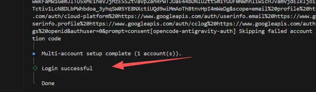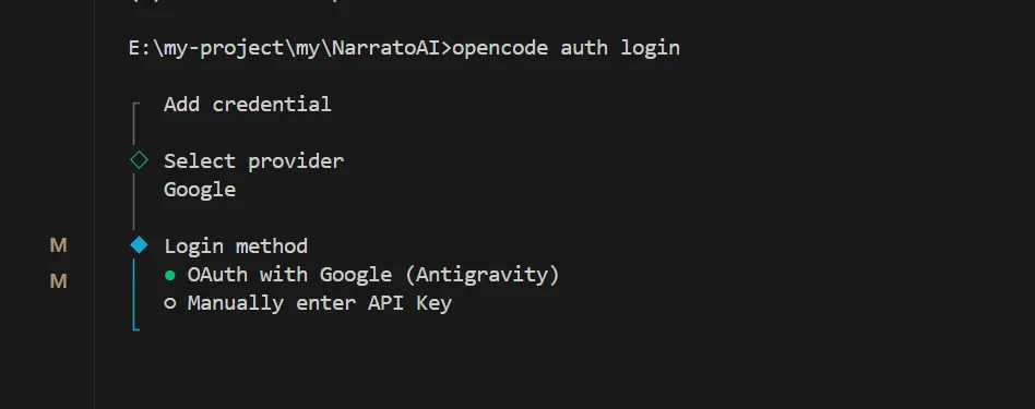 安装成功后需要登录获取凭证,执行下一个命令:opencode auth login(需要打开新的终端窗口去执行,不是在opencode窗口)选择 google 模型提供商,这时候会打开默认浏览器让你登陆 Google账号:Project Id:可以选择直接回车跳过如果浏览器不能直接登陆可以把最后的登陆地址复制到 终端里面