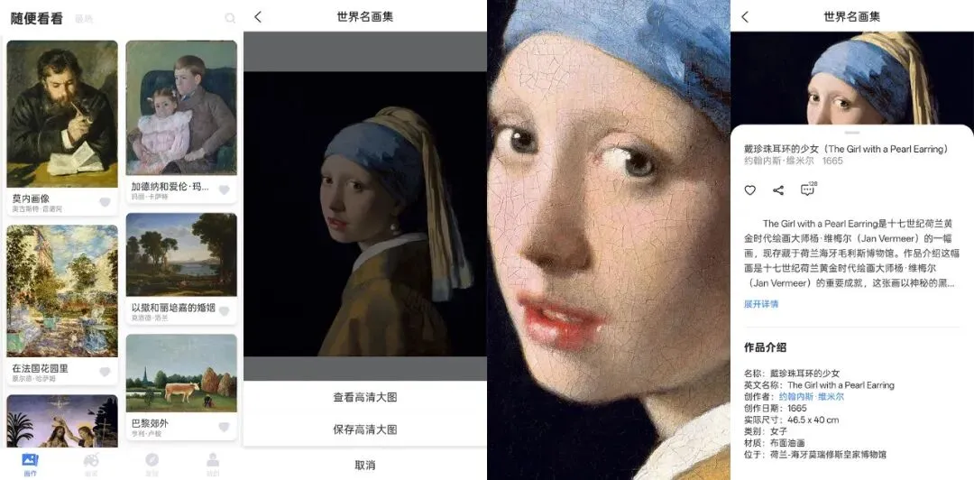 在观看体验上,它对普通用户非常友好。高清画质,支持放大查看细节,笔触、光影、人物表情都能看得很清楚。很多在书里只是“一张图”的作品,放大之后才发现,原来细节里藏着这么多情绪和选择。每幅画只给刚刚好的作品介绍,画家简介,点到为止,更多的理解空间,留给你自己慢慢消化。