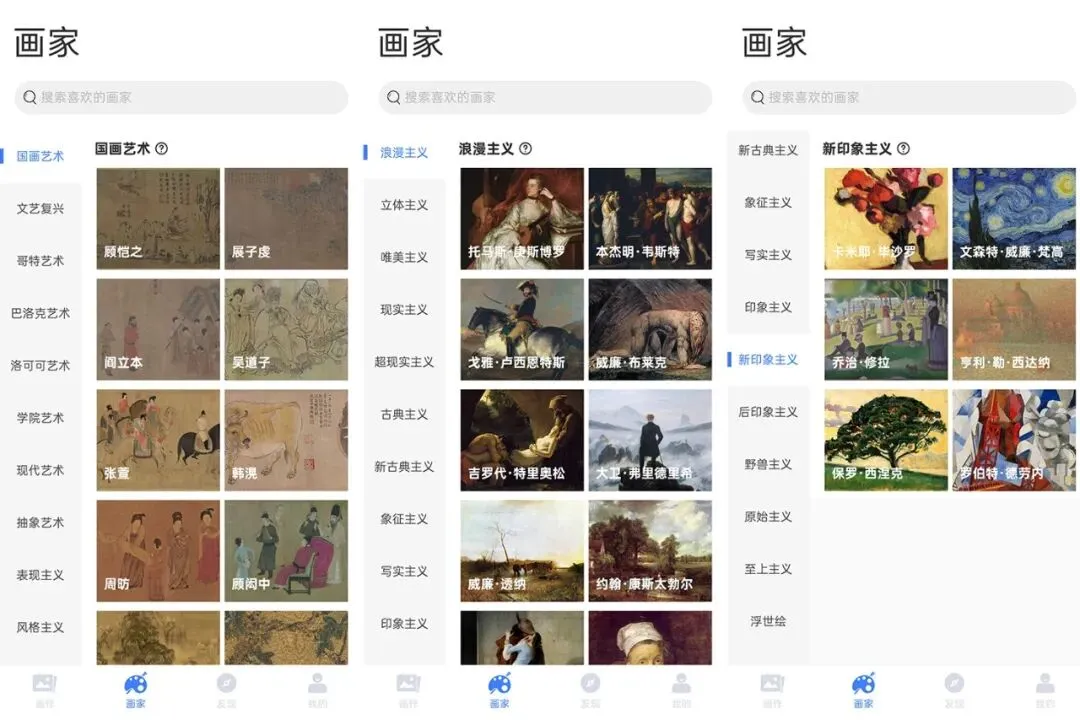 你可以随便看看主页推荐的各种最热的名画,也可以根据风格选择不同的画作,比如国画艺术、文艺复兴、哥特艺术、巴洛克艺术、洛可可艺术、学院艺术等等,共26种风格。