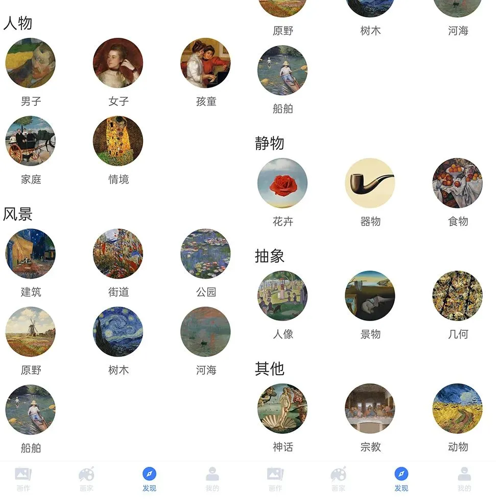 如果你想找某幅画,但又不想不起名字,只隐约记得画中好像有某种事物,这时,你就可以按照画作中的某处事物选择欣赏的画作,比如说人物中的男子、女子、孩童、家庭、情景,风景中的建筑、街道、公园、原野、树木、河海、船舶,静物中的花卉、器物、食物,抽象中的人物、静物、几何,其他中的神话、宗教、动物等,共21种类型。
