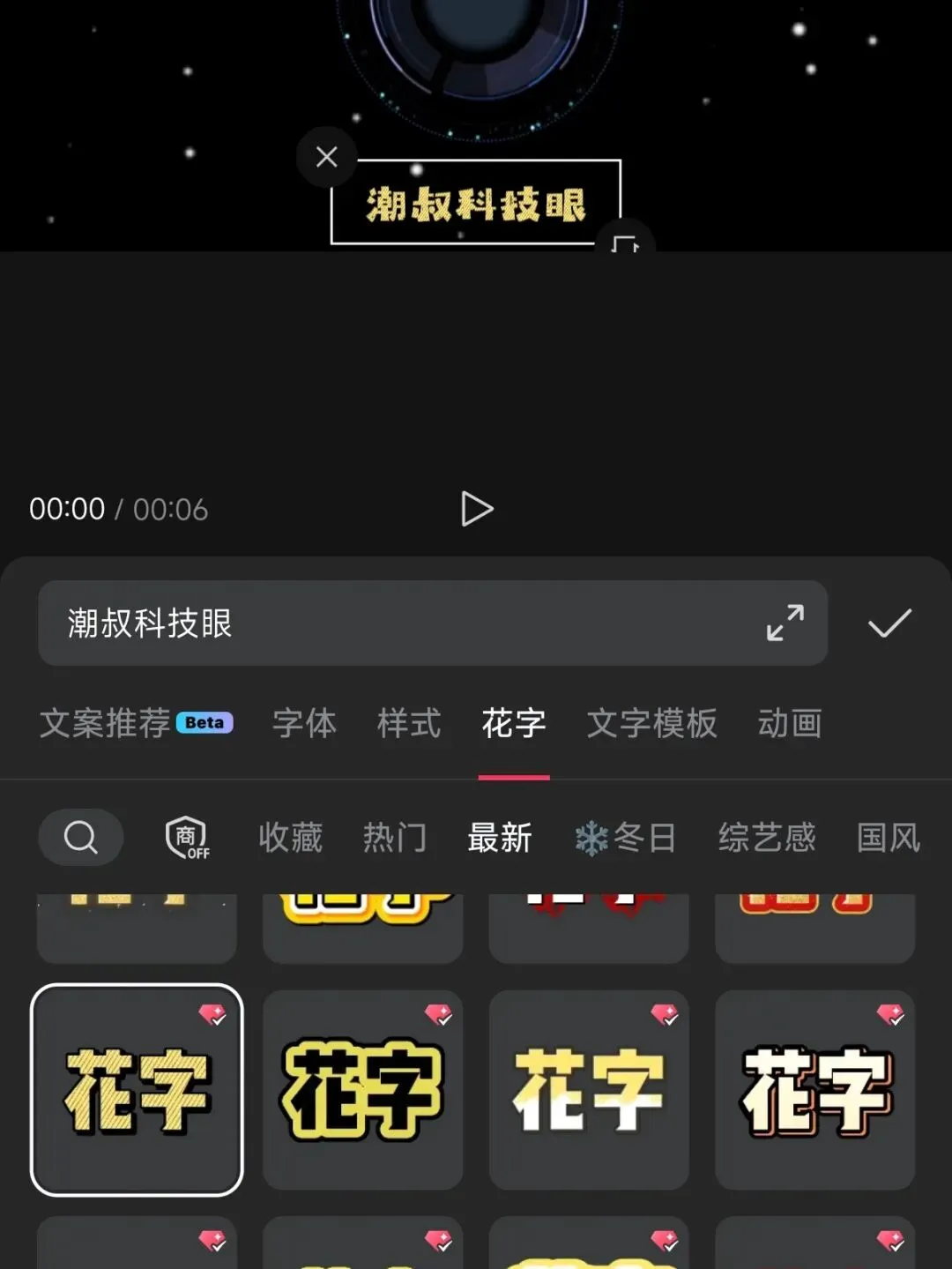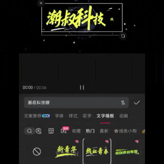 △文字模板:潮叔特意把这个功能放在最后说,因为上边说的样式、字体、花字和动画,都是手动设计字幕,折腾半天也不一定好看,这时候你需要借助文字模板,只需一键选择,让你的文本迅速提升逼格,如下图所示。