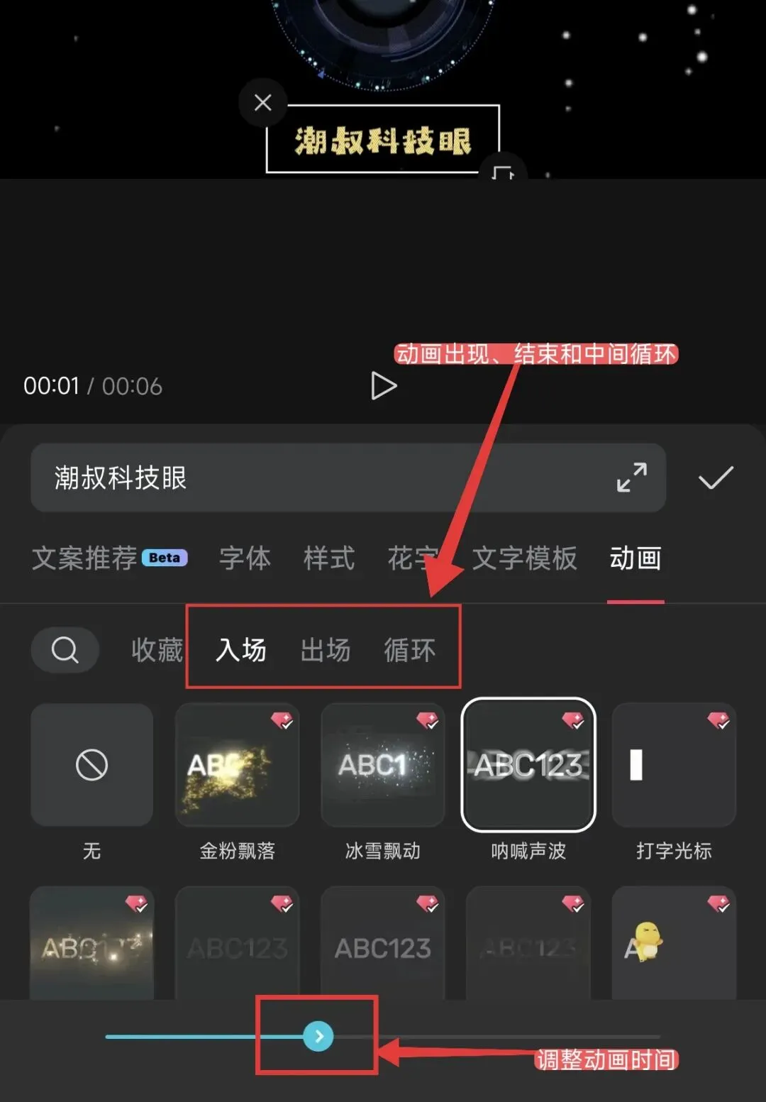 △动画:要想字幕好看,能与视频搭配,只有样式是不够的,点击动画面板,选择入场、出场和循环动画,让你的字幕动起来。如下图所示!