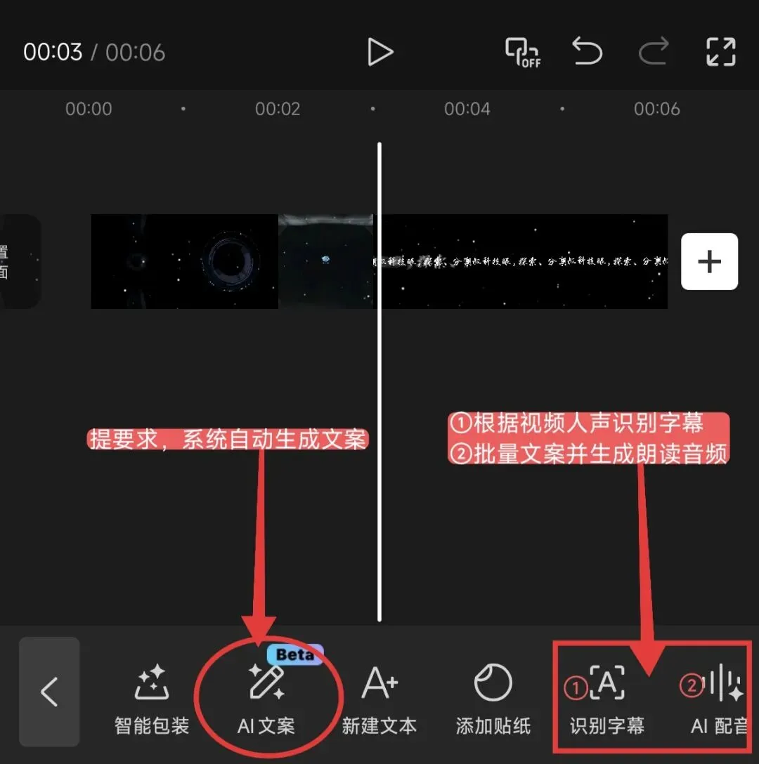 首先,剪映添加一段视频,在合适的位置点击底部菜单栏的「文本」→「AI文案」,如下图所示,潮叔还标记了「识别字幕」和「AI配音」(下边会讲解)。