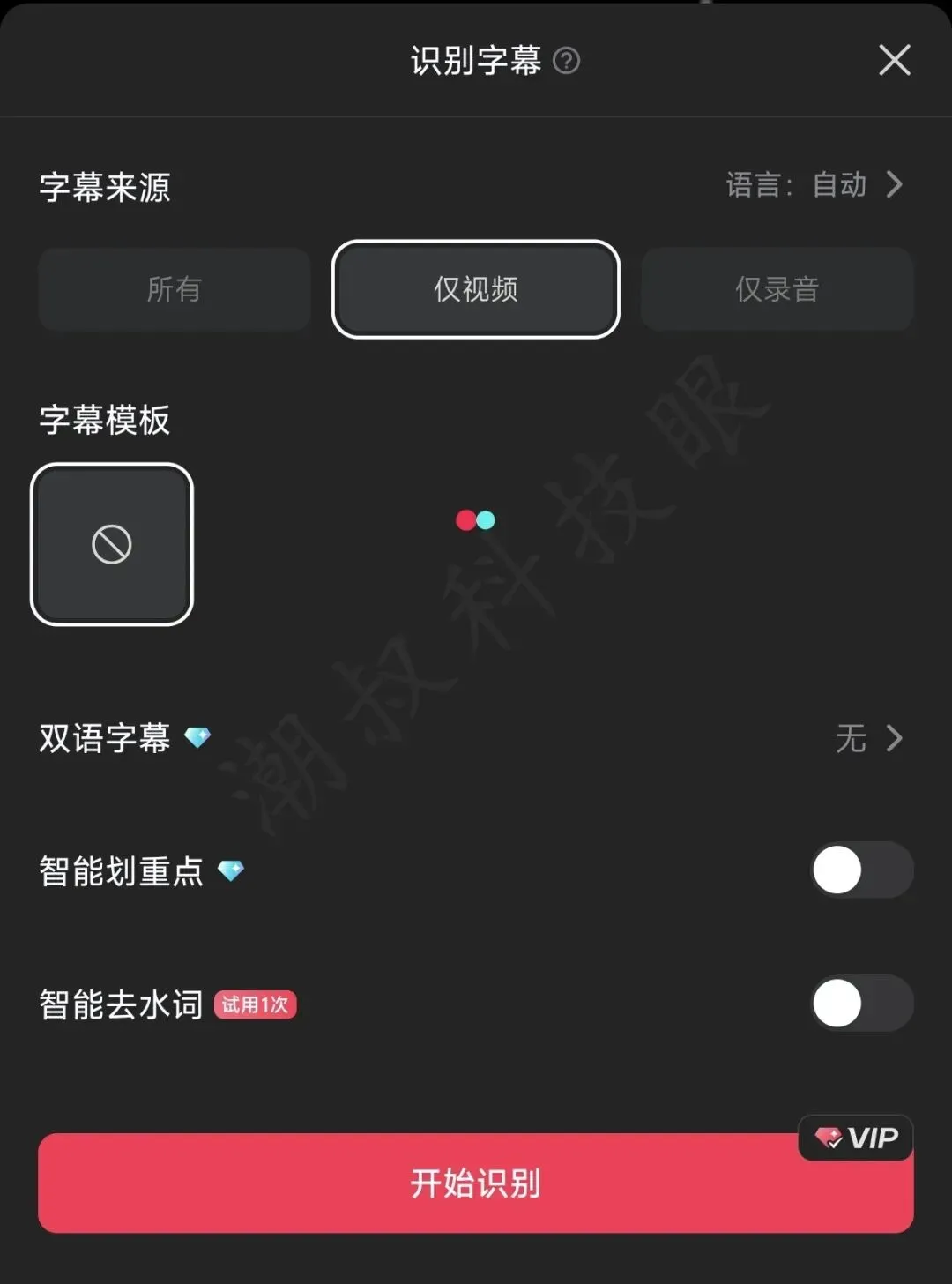 如果你的视频有人声,比如,人物对话、朗读等声音,添加字幕就更简单,点击底部菜单的「识别字幕」,弹出如下界面。