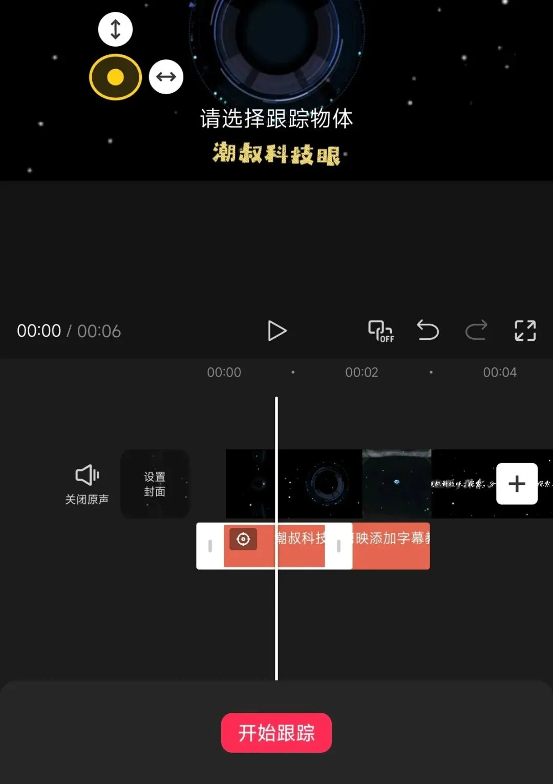 ③跟踪:可实现文本跟踪视频中的物体,操作很简单,只需要把字幕缩放到物体上,点击「开始跟踪」,系统自动完成。