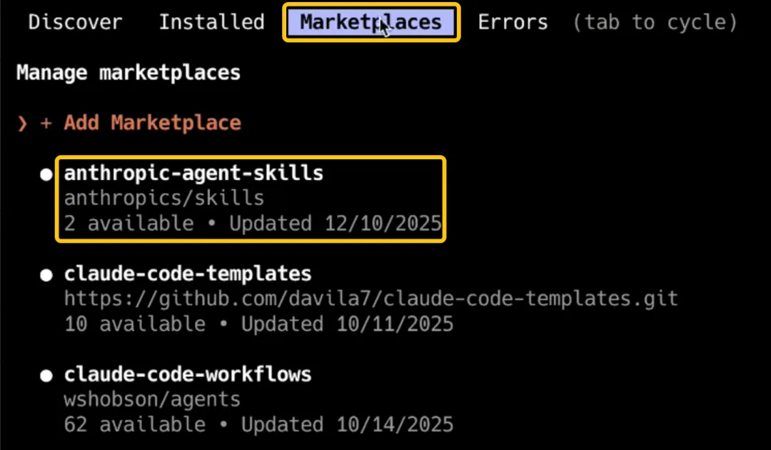 /plugin marketplace add anthropics/skills3. 添加完成后,运行