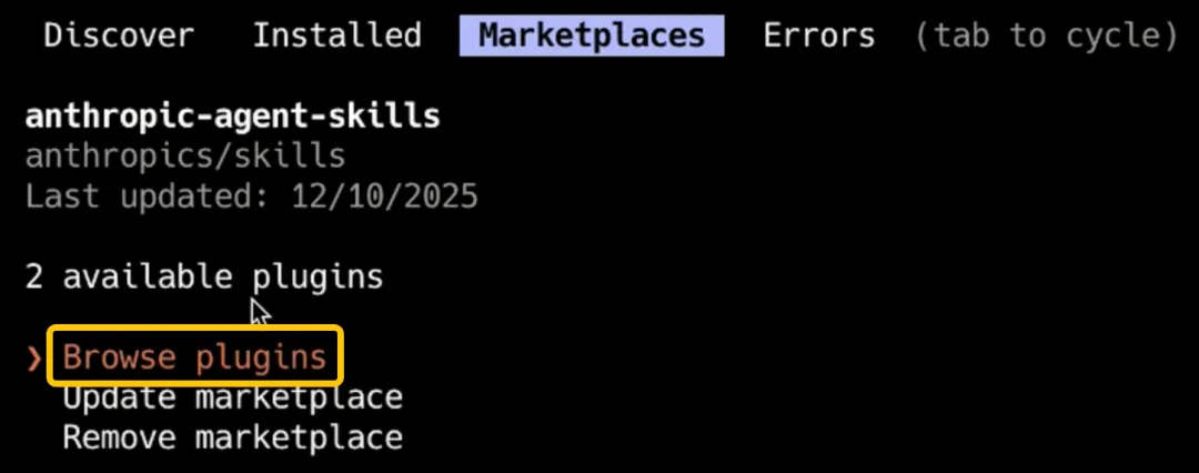 plugin,切换到Marketplace界面,就能看到我们刚刚添加的仓库;4. 按Enter键进入,选择第一个「Browse plugin」,再找到「example Skills」,里面就是frontend-design Skill,选中确认即可完成安装。