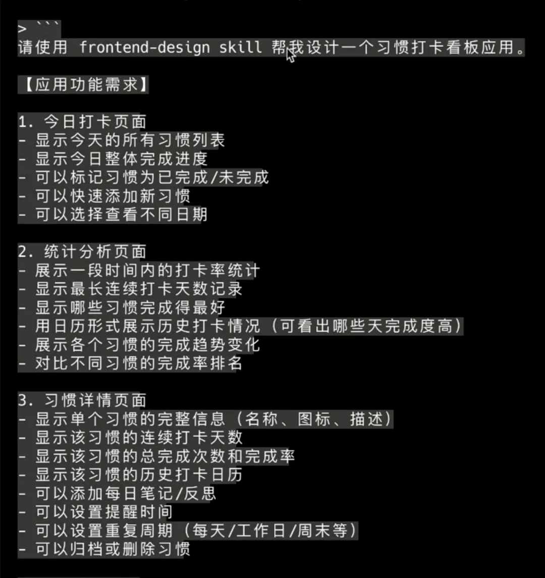 我给出了一些功能要求,但完全没有涉及UI层面的描述——所有界面设计都交给frontend-design Skill来完成,我们只需要明确APP的核心功能即可。