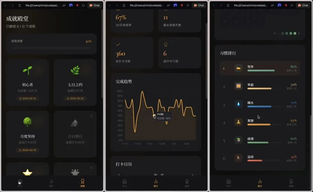 输入提示词后,等待片刻就能看到生成的APP设计稿,整体结构非常完整:包含习惯列表、数据统计、成就系统三大核心模块,布局规整、逻辑清晰,颜值和实用性双在线。
