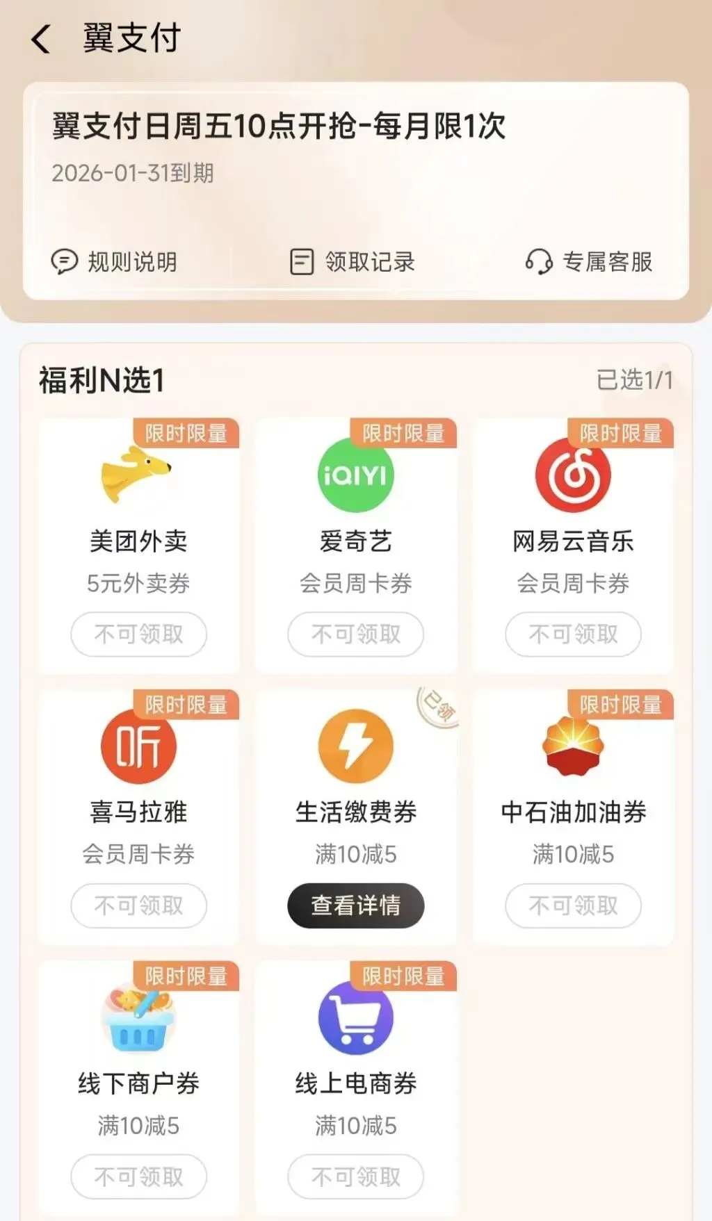 10.内蒙古翼支付,周五领5元,多号多领,每月一次
