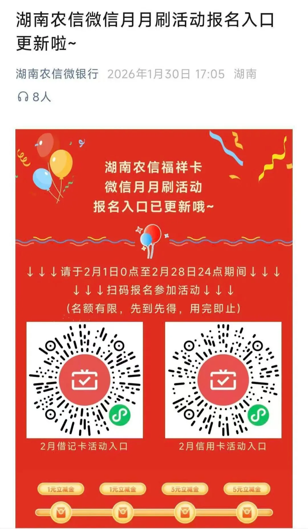 11.【工商银行】尊敬的客户,您好!工银兴农通新春有礼,即日起至2026年1月31日,登录兴农通APP并向兴农e钱包充值≥0.10元即可参与抽奖,奖品为微信立减金1.68-66.68元不等,数量有限,先到先得。如您本月已参加活动,请忽略此信息。详询95588。,回复TDYX退订。