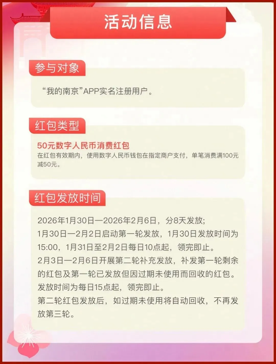 领取成功后,红包将自动发放至与“我的南京”实名手机号对应的数字人民币钱包。若尚未开通数字人民币钱包,请根据指引下载“数字人民币”App并完成开通。