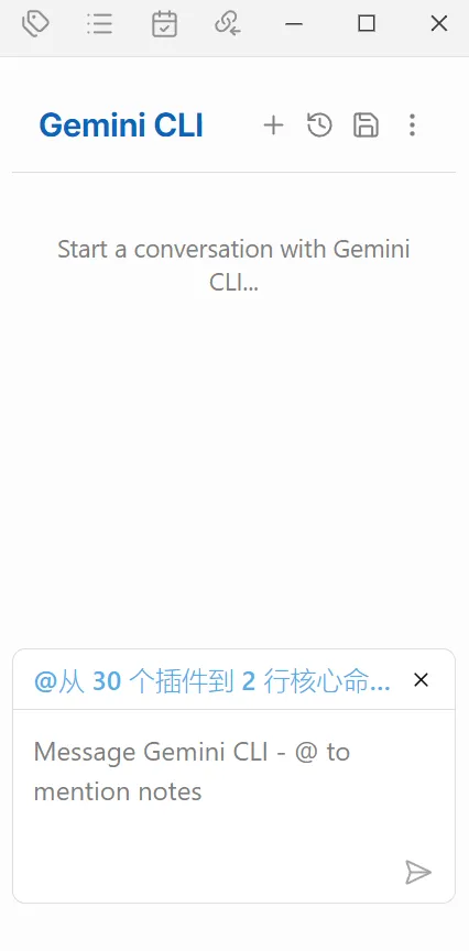 后来 Gemini CLI 问世,配合 Terminal 插件,我直接将终端嵌入 Obsidian tab 。这彻底解决了「拖拽」的痛点,因为在命令行里,Obsidian的原生拖拽能够被Terminal及Gemini CLI所识别,Agent Client就更不在话下。